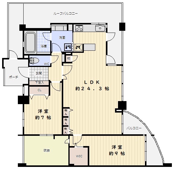 お部屋は最上階フロアの3方角部屋で、日当たり・通風・眺望良好な2LDK+WICです!キッチン・洗面室・浴室にも窓があり、風通し良くお住いいただけます♪洗面室と行き来可能な2WAYキッチンで、家事動線も考慮された生活便利な間取りです!LDKが約24.3帖あり、広々した開放感がございます!リビング・ダイニングは床暖房付で寒い日も暖かくお住まいいただけます♪全居室洋室仕様・7帖以上・収納があり、お掃除ラクラク・お部屋を広々ご利用いただけます♪ルーフバルコニーがあり、洗濯物が広々干せますね!